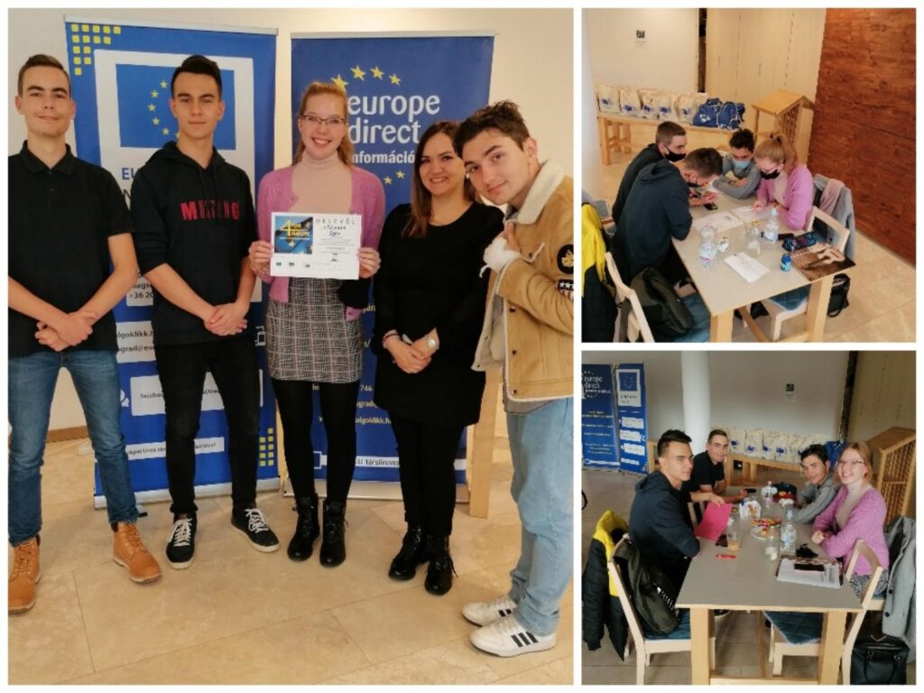 A 4 for Europe országos középiskolás vetélkedőjében csapatunk, a nEUmann a regionális forduló harmadik helyezését érte el. Kreatív feladatok, igazi tudás alapú kvíz tette izgalmassá a versenyt. A versenyben 4 feladat kapcsán mérték össze az észak- magyarországi régió csapatai tudásukat, próbára téve ismereteiket az Európai Unió témakörében, továbbá kamatoztathatták szituációs készségeiket a rögtönzött szerepjáték feladatokban. Az egész napos program alkalmat adott arra is, hogy iskolán kívüli kapcsolatokat ápoljunk a részt vevő csapatokkal, s hogy megcsodálhassuk a helyszín szépségeit Szentkúton. Csapatunk minden tagjának – Mátyás Viola Panna 11E, Erdélyi Botond, Fedák Zsombor, Pásztor Ákos Patrik 10E – és felkészítő tanáraiknak, Dr. Plesuné Simon Krisztina és Kurta Fruzsina tanárnőknek, szívből gratulálunk!