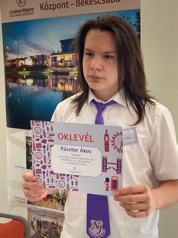 Az Országos Angol Tanulmányi Verseny 3. fordulóját Békéscsabán rendezték meg, ahová a 7. évfolyamon 25 versenyző kerülhetett be az első fordulóban még 3086 induló közül. Pásztor Ákos 7K osztályos tanulónk kiemelkedő teljesítményt nyújtott és az országos 5. helyezést szerezte meg. Szeretettel gratulálunk a szép eredményhez Ákosnak és felkészítő tanárának, Csikós Nóra tanárnőnek!